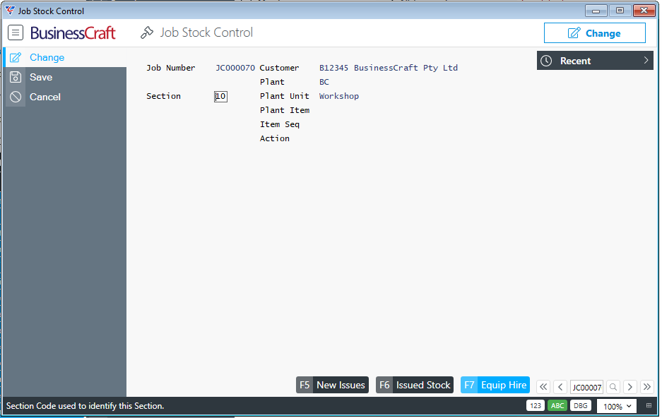To record the return of equipment previously booked on a job, go to Job Costing > Transactions > Cost Entry > Job Stock Control and select the Job (and where applicable the Section) holding the booking.