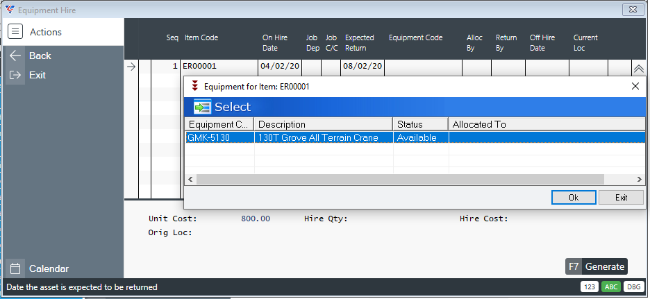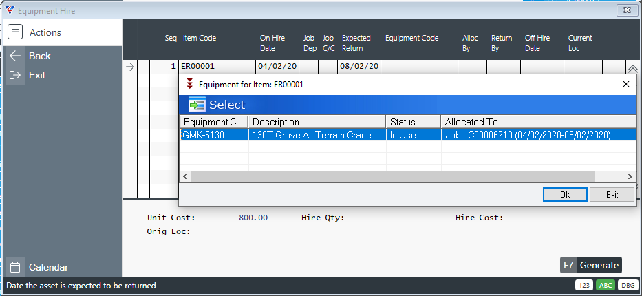 Use the Equip Hire (F7) function key to open the Equipment Hire screen to book the Equipment. Enter/select the Item Code for the Equipment Service required, the commencement date of the booking, depending on Job Costing setup the Job Department and Job Cost Centre and the Expected Return Date of the Equipment. A pop up will appear displaying the Equipment that can be used to provide the service and its availability or in use status: