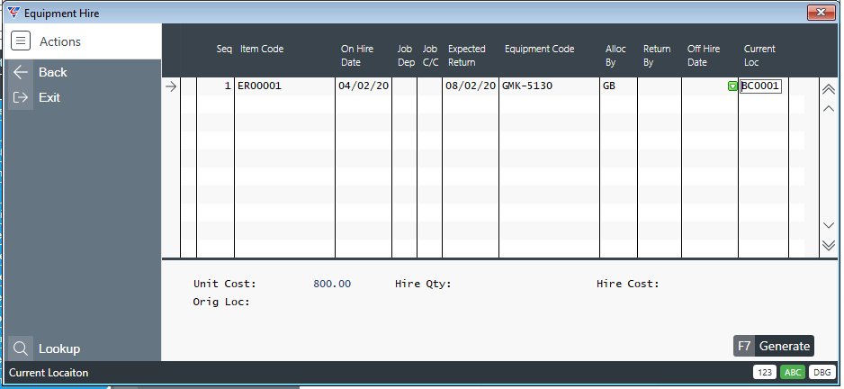 Use the Equip Hire (F7) function key to add the service to be provided, record a start hire date, an expected return date, the user creating the hire record and optionally the current location of the equipment.
