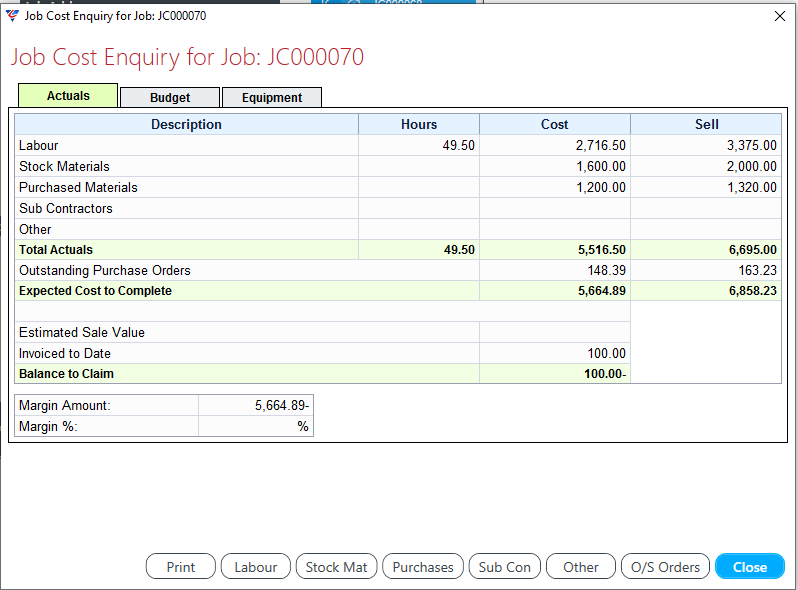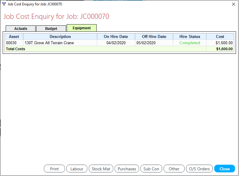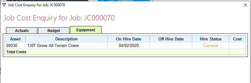To see the booking on the job, go to Job Costing > Maintain > Jobs and locate the job. Use the Costs (F7) function key to open the Job Cost Enquiry screen and click on the Equipment Tab: