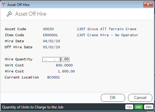 After reviewing the Asset Off Hire screen and making any required changes to the quantity or current location, click OK and exit back to the main menus.