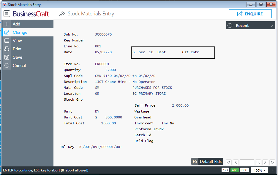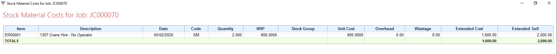 The Stock Materials line in the Job Cost Enquiry reflects the total of all Job Cost Material transactions including completed Equipment Register bookings. In this example, there were no other material transactions so the line reflects the $1600 cost of the equipment for 2 days and the recommended sell price of $2000 for the two days.