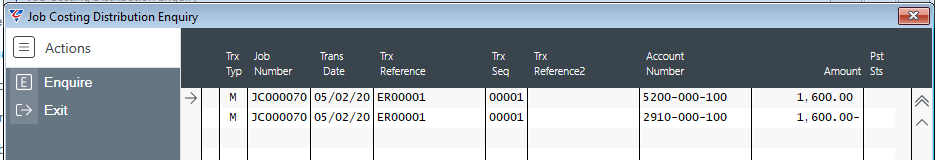 Job Costing Distributions are created reflecting the Materials Job Costing Transaction