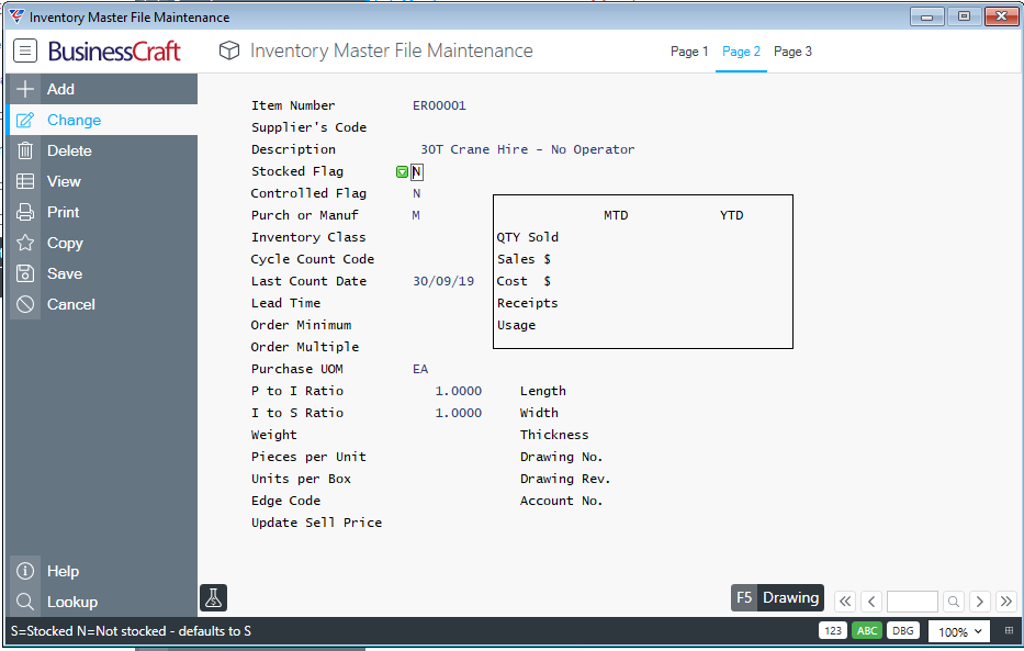 On Page 2 of the Inventory Master File Maintenance screen, make sure the Item is Not Stocked and Not Controlled: