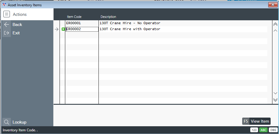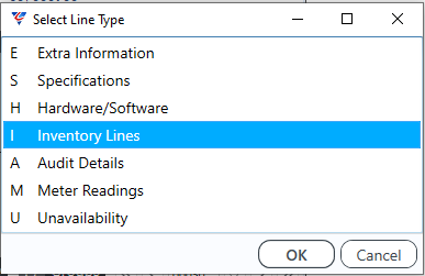 Select Inventory Lines to open the Asset Inventory Items screen and enter/select the required item codes for the services that the equipment can provide: