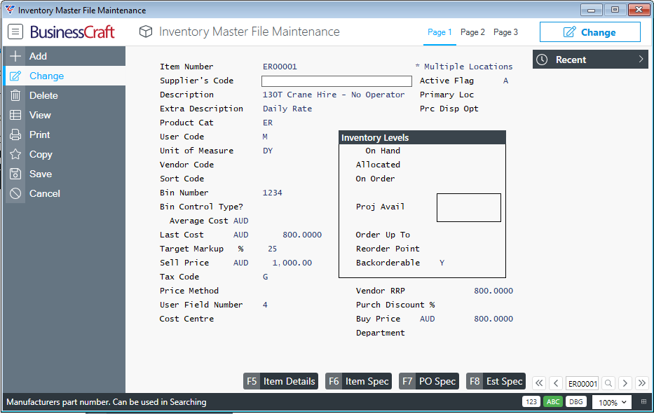 | Item Number | It is recommended that a coding system is used that distinguishes equipment hire items from item codes used for usual inventory processing. |
