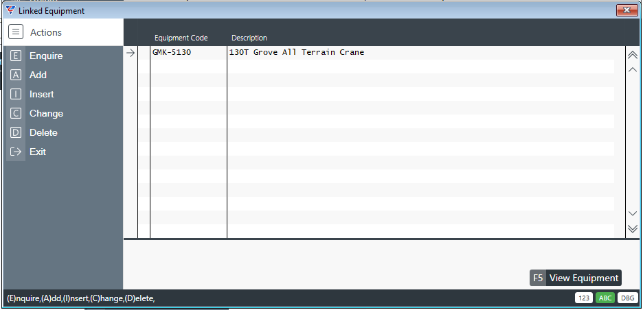 The View Equipment (F5) function key opens the Equipment Maintenance screen for the Equipment Code for the selected line.